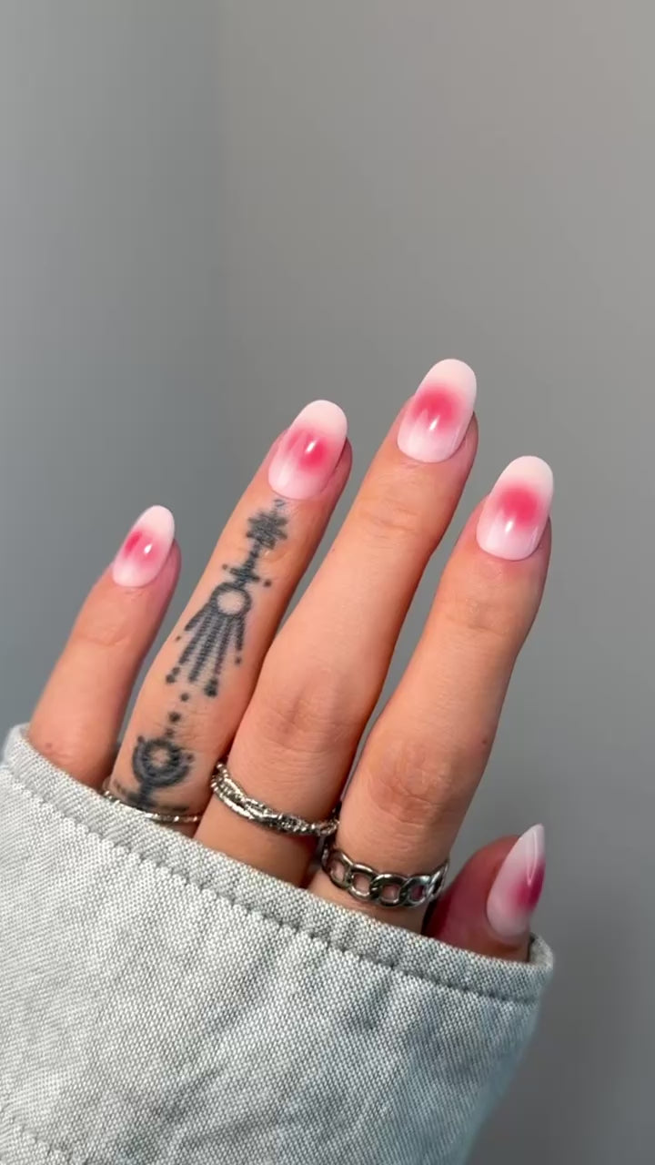 This luminous ombré manicure blends soft red and rose-pink hues into a pearly gradient that flatters every skin tone. With a glossy square tip and a smooth satin shimmer, these nails bring effortless warmth to your look—whether you’re headed to brunch, a meeting, or a romantic night out. Classy yet fun, they’re your new go-to for radiant everyday elegance. 💖